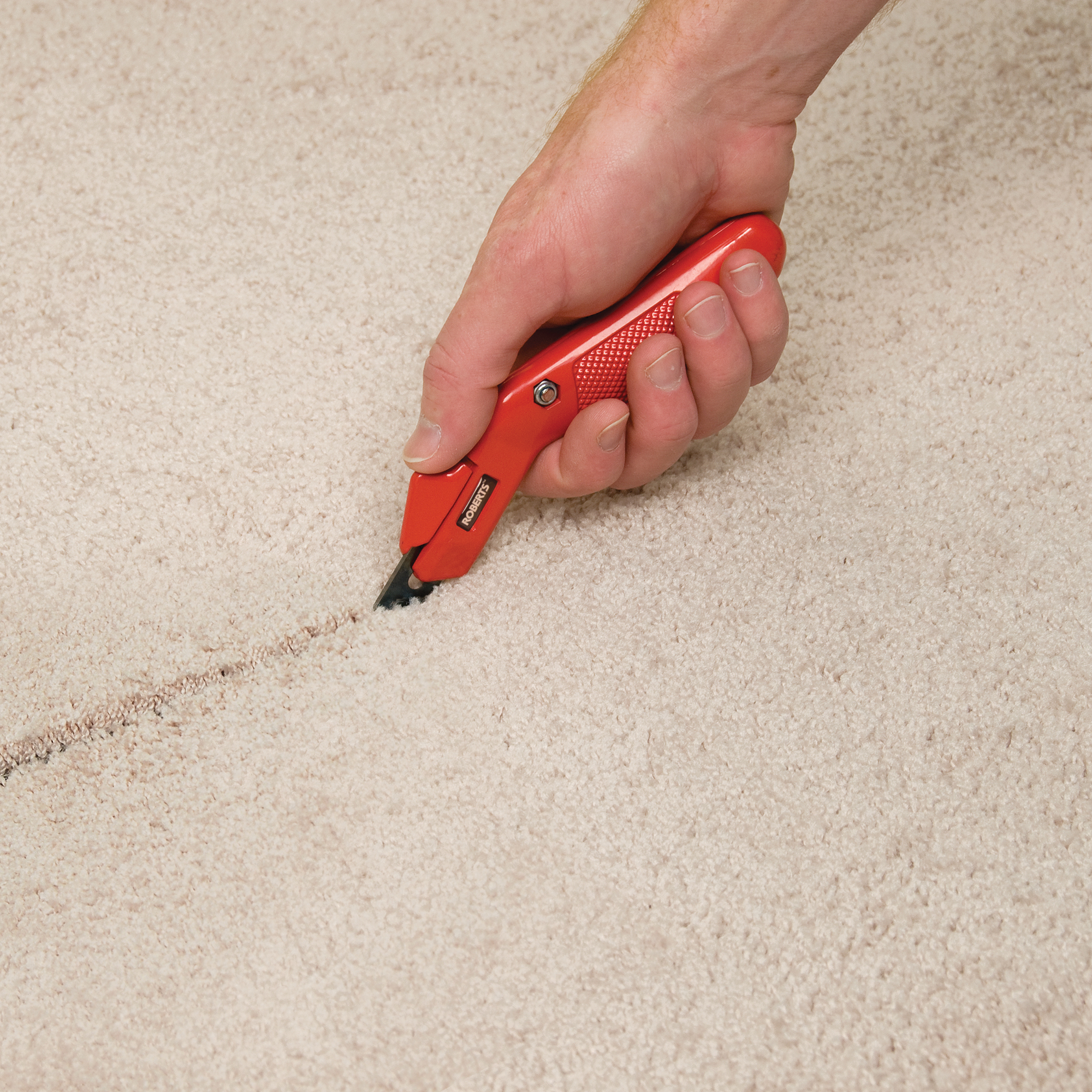 Trim and size carpet with the ROBERTS carpet knife that features a slip-resistant grip and a safety thumb stop. The knife comes with 3 blades and convenient blade storage in the handle.